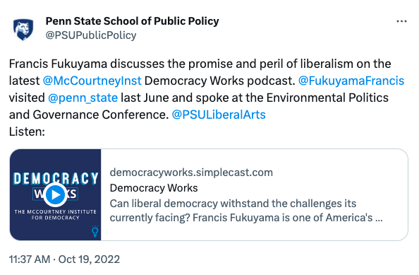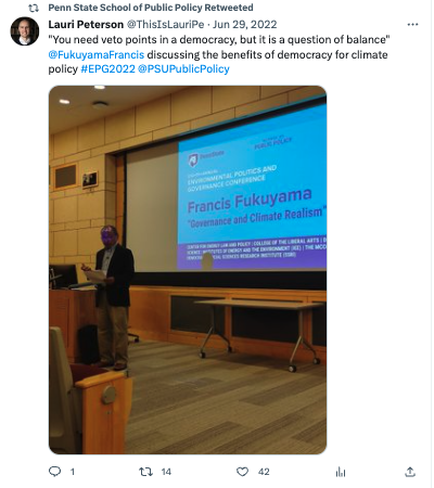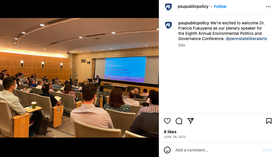Penn State hosted the 8th Annual Environmental Politics and Governance (EPG) Conference on June 28 – July 1, 2022, building on the success of previous conferences in Seattle, Zurich, Bloomington, Stockholm, Santa Barbara, and Oslo. The conference’s primary goals were to showcase the best empirical research on environmental politics and governance from relevant disciplines and provide a venue for scholars to strengthen their networks and shape future research directions. The keynote speaker was Francis Fukuyama, an American political scientist, political economist, international relations scholar and writer.