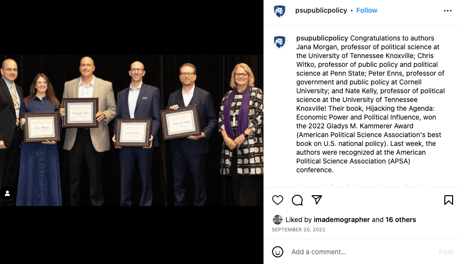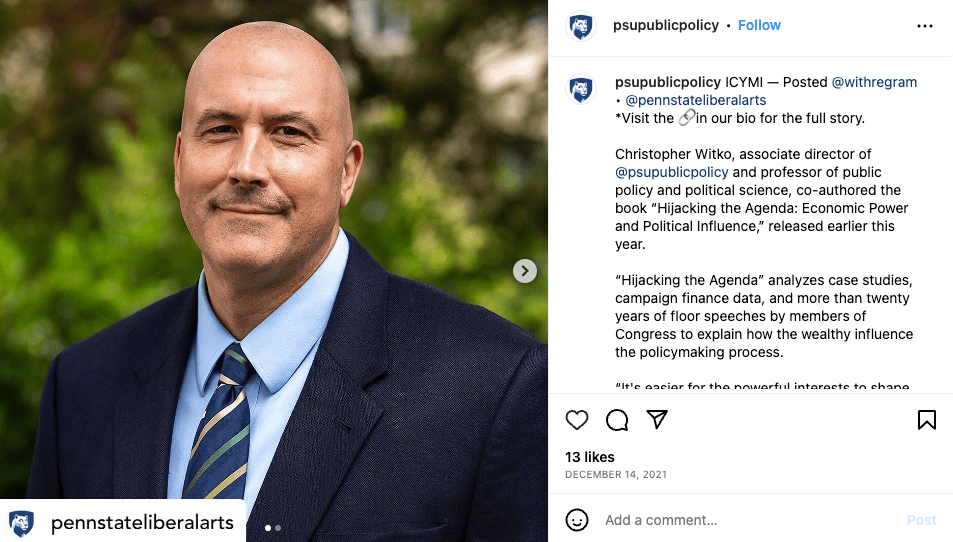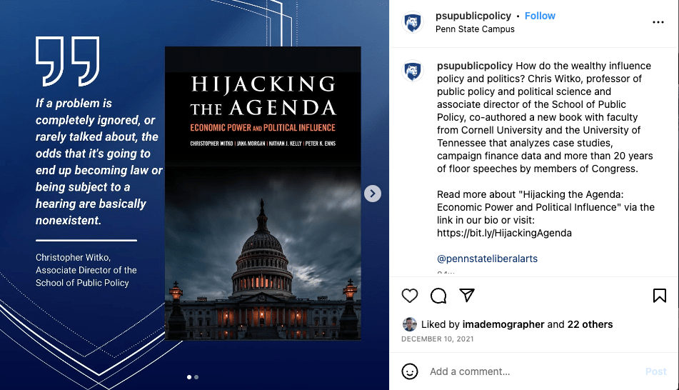 Policy decisions that prioritize the needs of businesses and the wealthy over average Americans are not unusual, writes Christopher Witko, professor of public policy and political science and associate director of the School of Public Policy, in his co-authored book, “Hijacking the Agenda: Economic Power and Political Influence.” The book received the 2022 Gladys M. Kammerer Award (American Political Science Association’s best book on U.S. national policy).