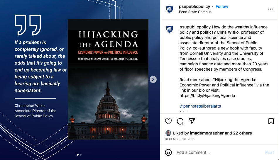 Policy decisions that prioritize the needs of businesses and the wealthy over average Americans are not unusual, writes Christopher Witko, professor of public policy and political science and associate director of the School of Public Policy, in his co-authored book, “Hijacking the Agenda: Economic Power and Political Influence.” The book received the 2022 Gladys M. Kammerer Award (American Political Science Association’s best book on U.S. national policy).