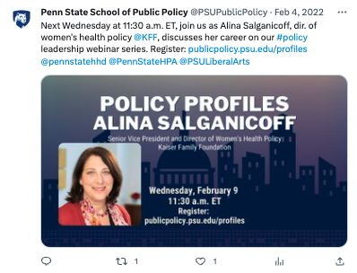 To help introduce MPP students to various career paths, provide opportunities to make professional connections, and promote the program, I worked with the director of professional development at Penn State’s School of Public Policy to create a virtual leadership series.
